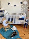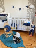 Accrochée au mur de la chambre de votre bébé, cette guirlande de fanions apportera une jolie décoration. Cette décoration murale peut s'accorder au range doudou de la même collection, et pour une déco complète à la parure de lit et au coussin lune dans les mêmes tissus.